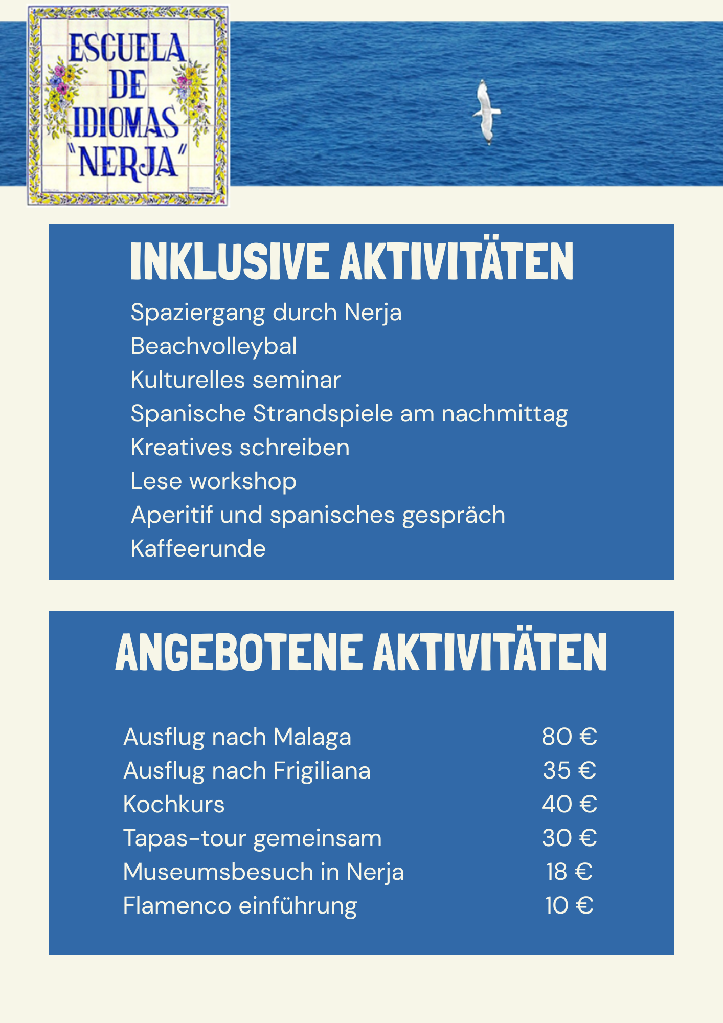 Das Studium einer Sprache endet natürlich nicht an der Tür des Klassenraumes. Unsere Kurse sind vielmehr so etwas wie authentische „Eintauch-Programme ins Spanische“ zu sein, für die wir vielfältige kulturelle und auch soziale Aktivitätsprogramme ausgearbeitet haben, an denen Sie in Ihrer Freizeit teilnehmen können.